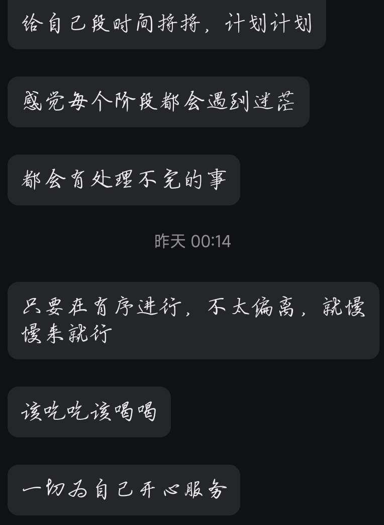 相较于考研,其他选择似乎会有看上去还算凑合的保底,加上当前大环境下对考研真的能否改变现在的窘境持怀疑态度,所以我的选择自然也往考研相反的方向发生了倾斜。现在看来,很多时候其实我们真的没有很多选择,大多数时候都是身不由己,不是我们想做什么,而是我们能做什么。可能最后我还是会被推向天平的另一端,那就收拾好行李再最后好好 All in 一次吧,说起来好像从来都没有真真正正的在一件事情上 All in 过,哪怕高考考过后也觉得稀松平常,但这次好像真的比高考还要迷茫和焦虑,或许是因为真的到了自己要为自己负责的一次重大抉择吧。